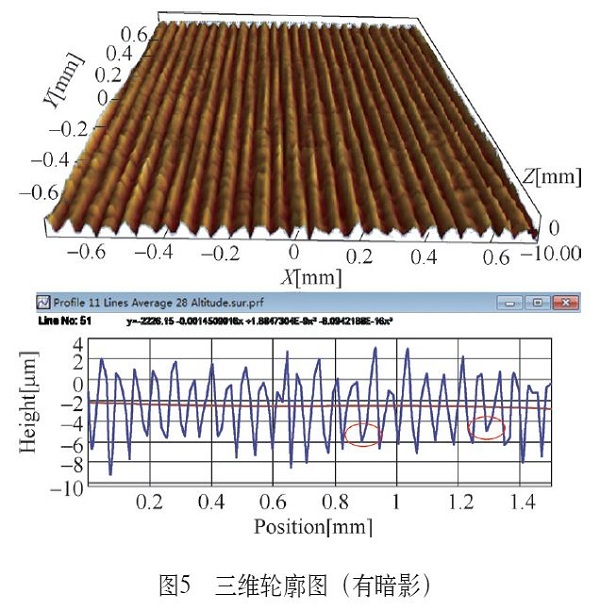 使用三维轮廓仪检测工件外表面可以发现暗影在微观上是由于车刀纹的凸峰和凹谷宽窄不均及波峰波谷值浮动较大,主要表现在凹谷比较宽而产生暗影现象(见图4、图5)。