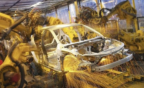 手工电弧焊在汽车制造中应用得不多。在汽车车身制造中应用最广的是点焊。点焊适于焊接薄钢板,操作时,2个电极向2块钢板加压力使之贴合并同时使贴合点(直径为5—6甽的圆形)通电流加热熔化从而牢固接合。2块车身零件焊接时,其边缘每隔50—100甽焊接一个点,使2零件形成不连续的多点连接。焊好整个轿车车身,通常需要上千个焊点。焊点的强度要求很高,每个焊点可承受5kN的拉力,甚至将钢板撕裂,仍不能将焊点部位分离。