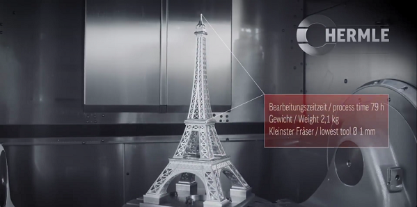 作为中小型精密五轴加工领域的专家,德国哈默公司在复杂曲面加工、负角度加工以及高精密加工跟高速加工方面都有相当丰富的经验,最近,哈默公司发布了一则视频,使用五轴cnc加工机床制造了一件埃菲尔铁塔的模型,其机构的复杂性跟难度已经能够跟3D打印的模型一较高下;