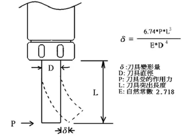 L:装刀的长度,从公式中我们可以发现,刀具的变形量跟装刀的长度是三次方的关系,同样直径的刀具,如果长度增加一倍,其变形量将会被放大三倍;